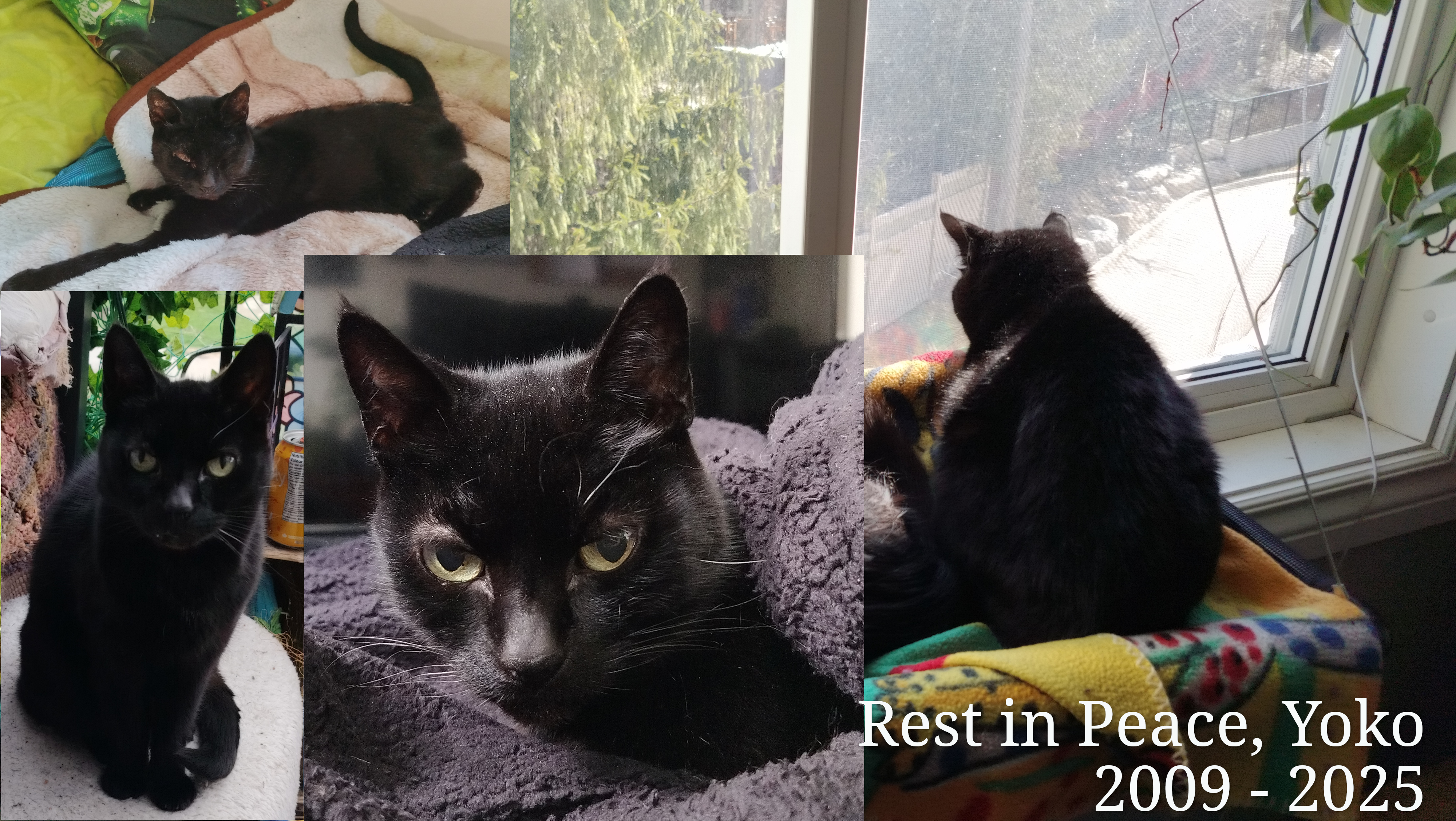 On 19 June 2025, Yoko passed away at home from congestive heart failure as a symptom of old age. She passed a mere two days after the diagnosis. She died peacefully under my bed laying on top of a blanket she slept on almost every day, as I was caressing her head. Witnessing the life drain from her eyes as her body fell limp was an experience that I never thought I would witness. That moment is something I will never forget, but the thousands of happy memories of her will always live on as well. Her body was cremated, her ashes and bone meal kept in a silk pouch in a special place in my home. Her presence is missed more and more every single day, as now my bed is empty each day.